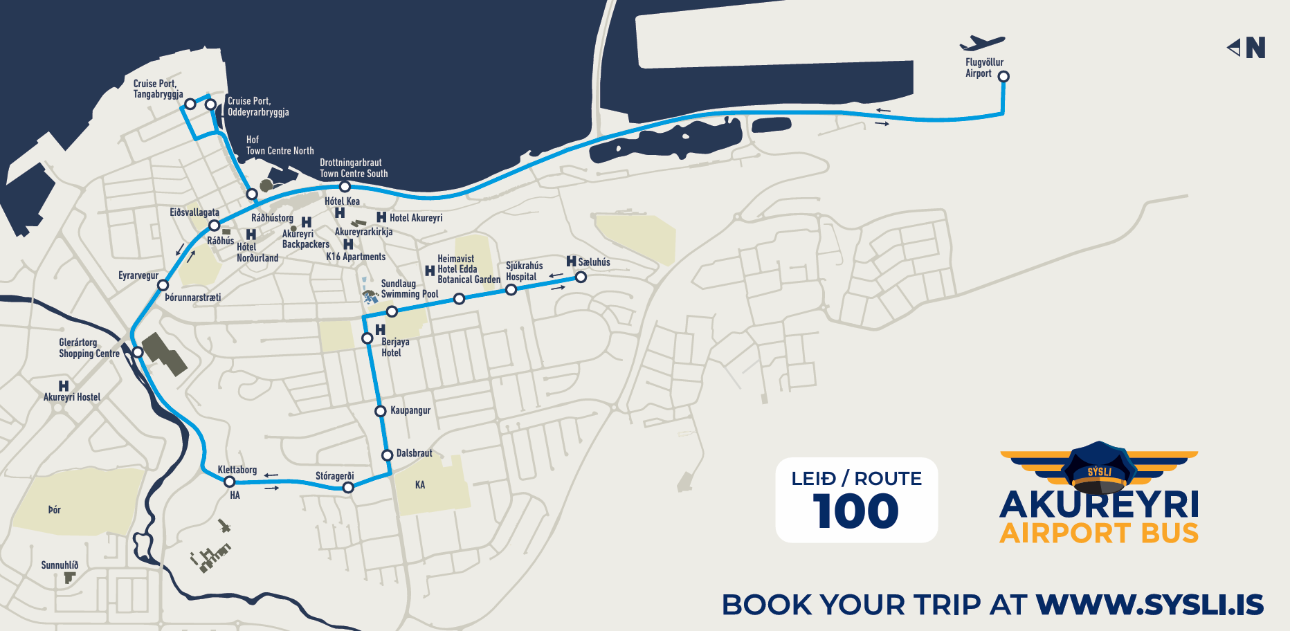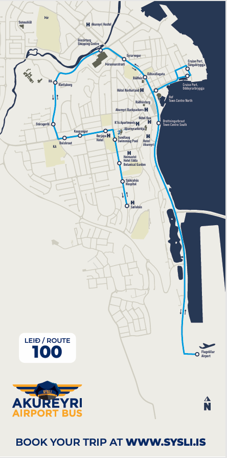 The route connects Akureyri Airport with the town of Akureyri. The route passes all of the main hotels in Akureyri and the campsite. Please note that we do not go into the hotels to pick up passengers.